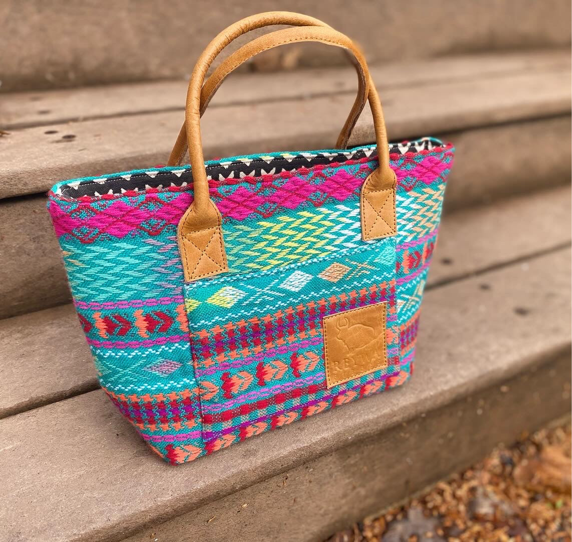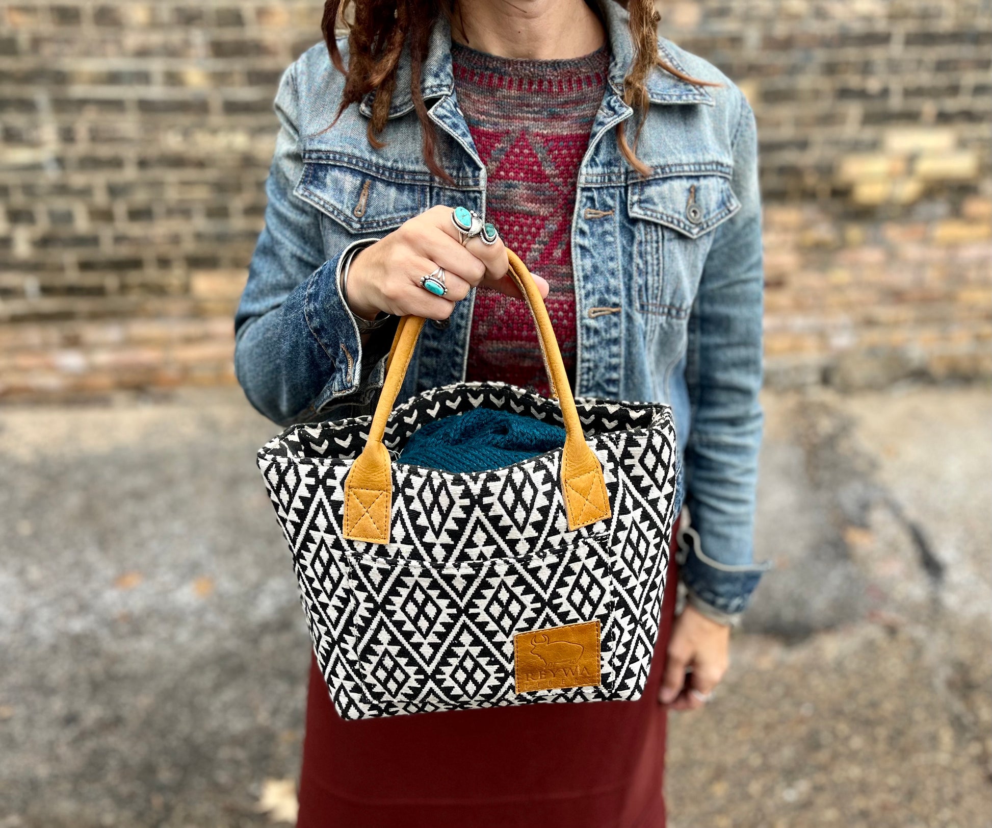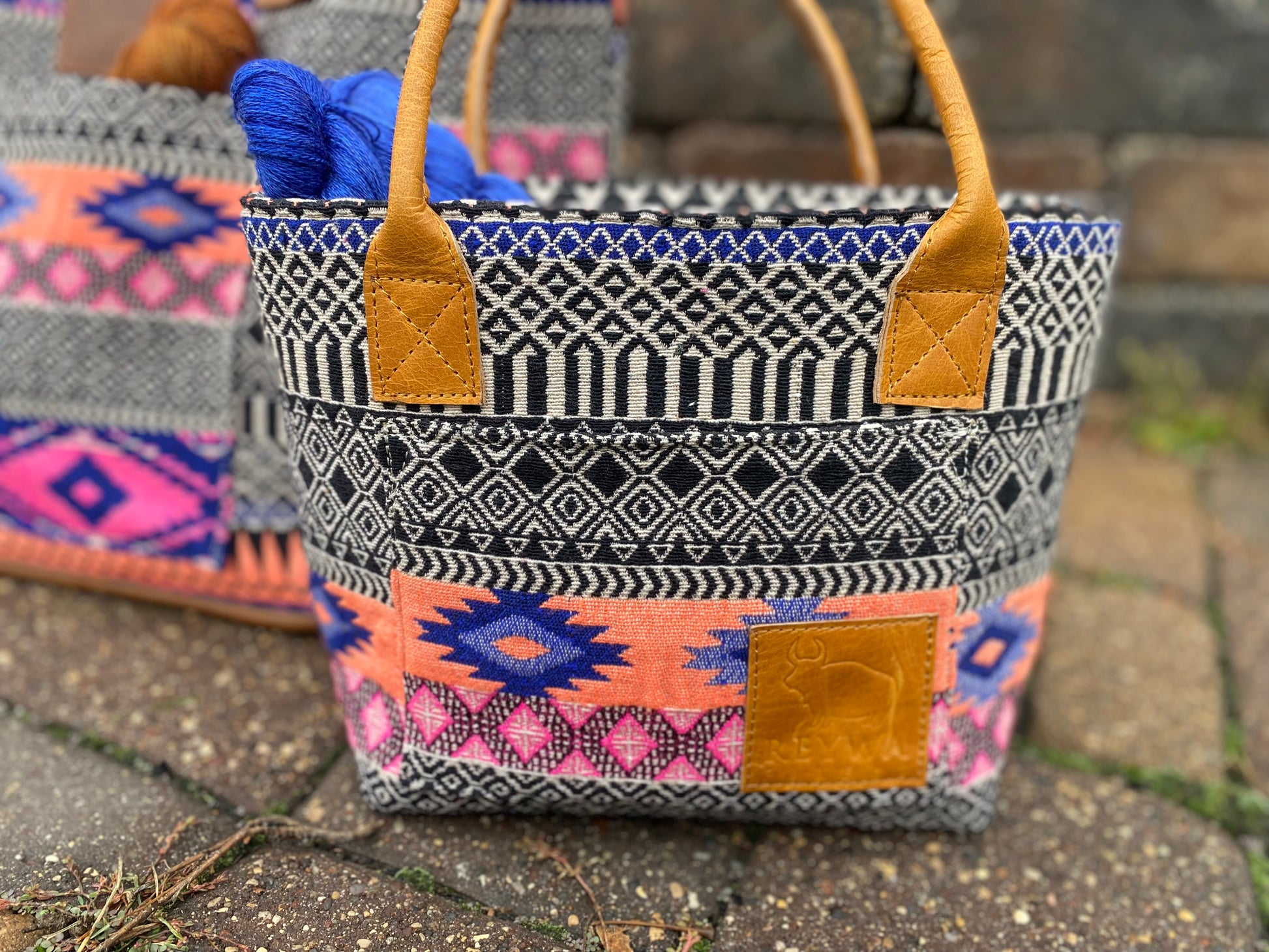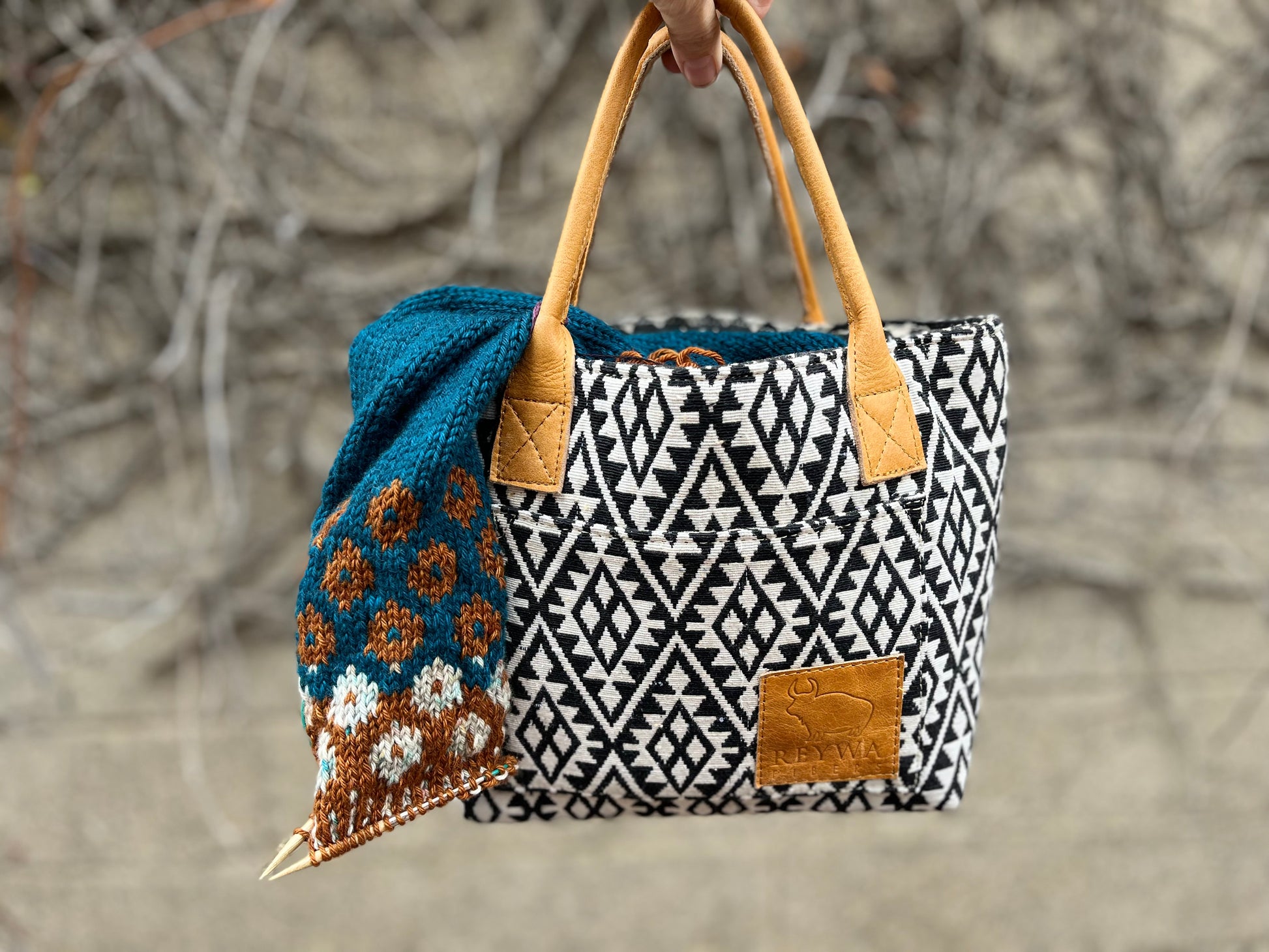 Reywa Fibers’ Classic Bucket Bag is the essential knitter’s project bag which easily accommodates small to medium sized projects. Each bag is lovingly made by a team of artisans in Northern India who earn a living wage while gaining vocational training. The buttery-soft, camel colored handles are made from water buffalo leather (along with all materials—except block printing ink—used in the creation of these bags) is repurposed from large factory surplus. This is a win-win, keeping costs lower for you, and saving usable fabrics from landfills.
