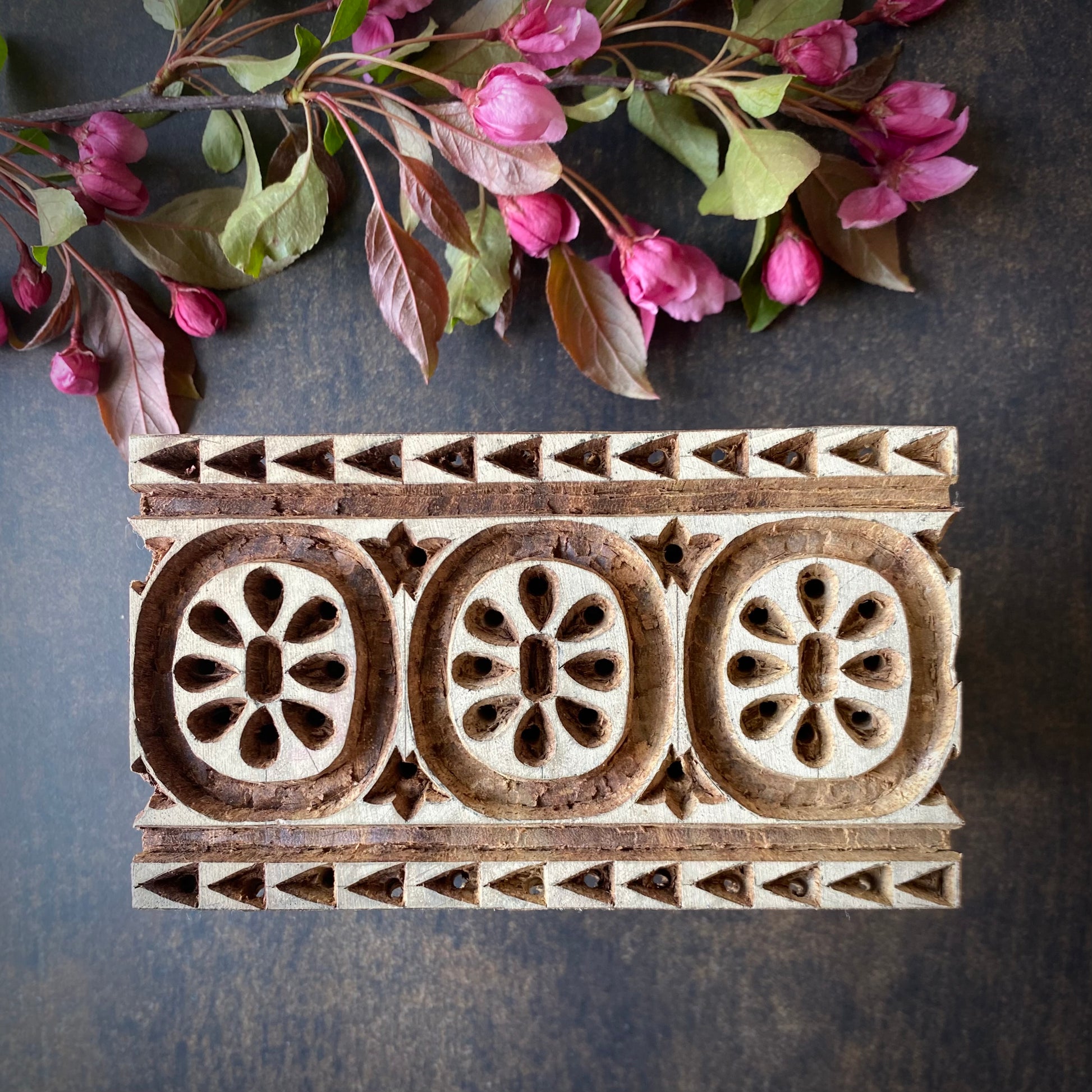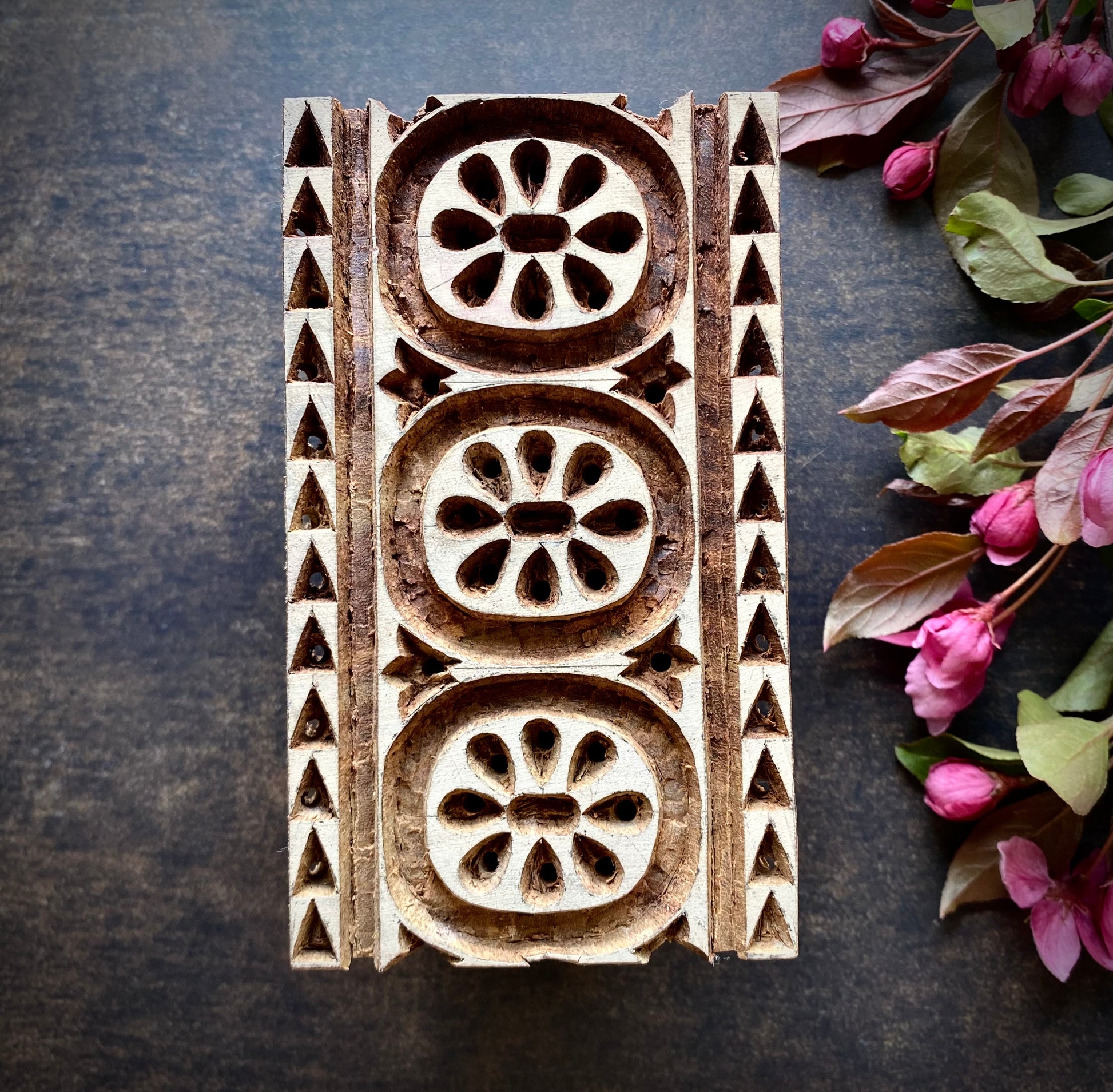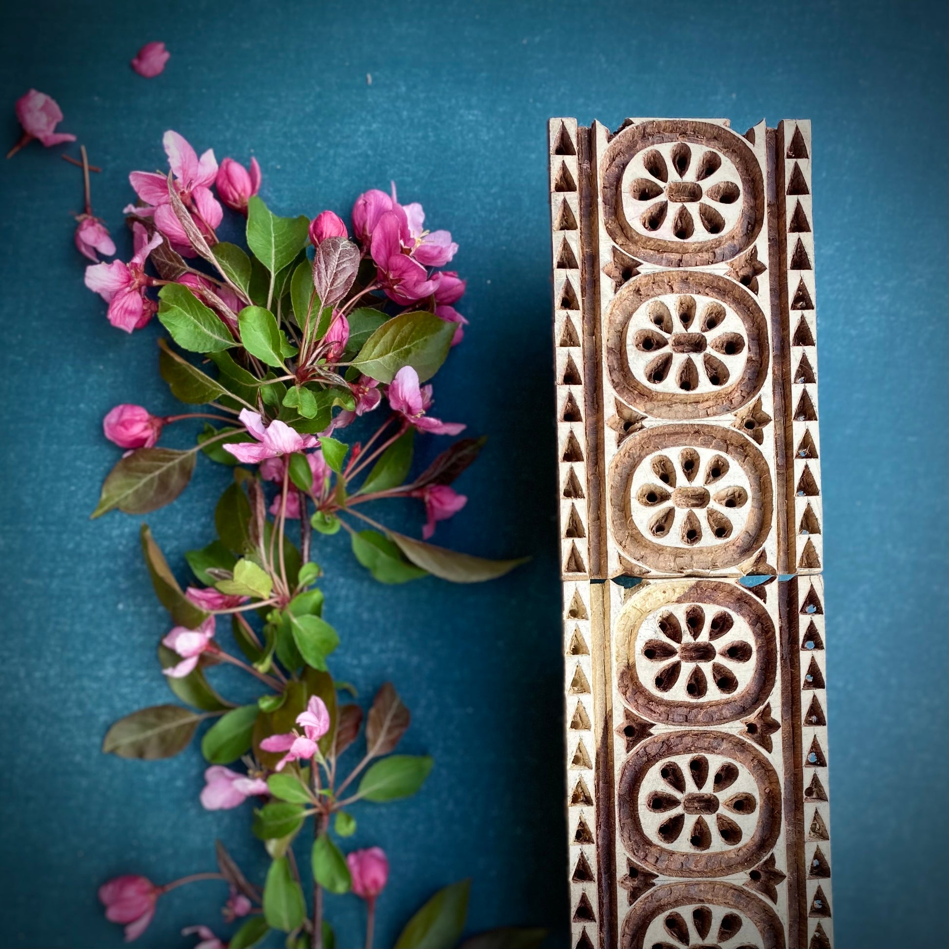 The large border stamp features a traditional Indian block print design. The bold geometric shapes can be stamped repeatedly to create a continuous design, or it stands alone as a beautiful focal point. Hand carved by Pappu in Delhi, India.