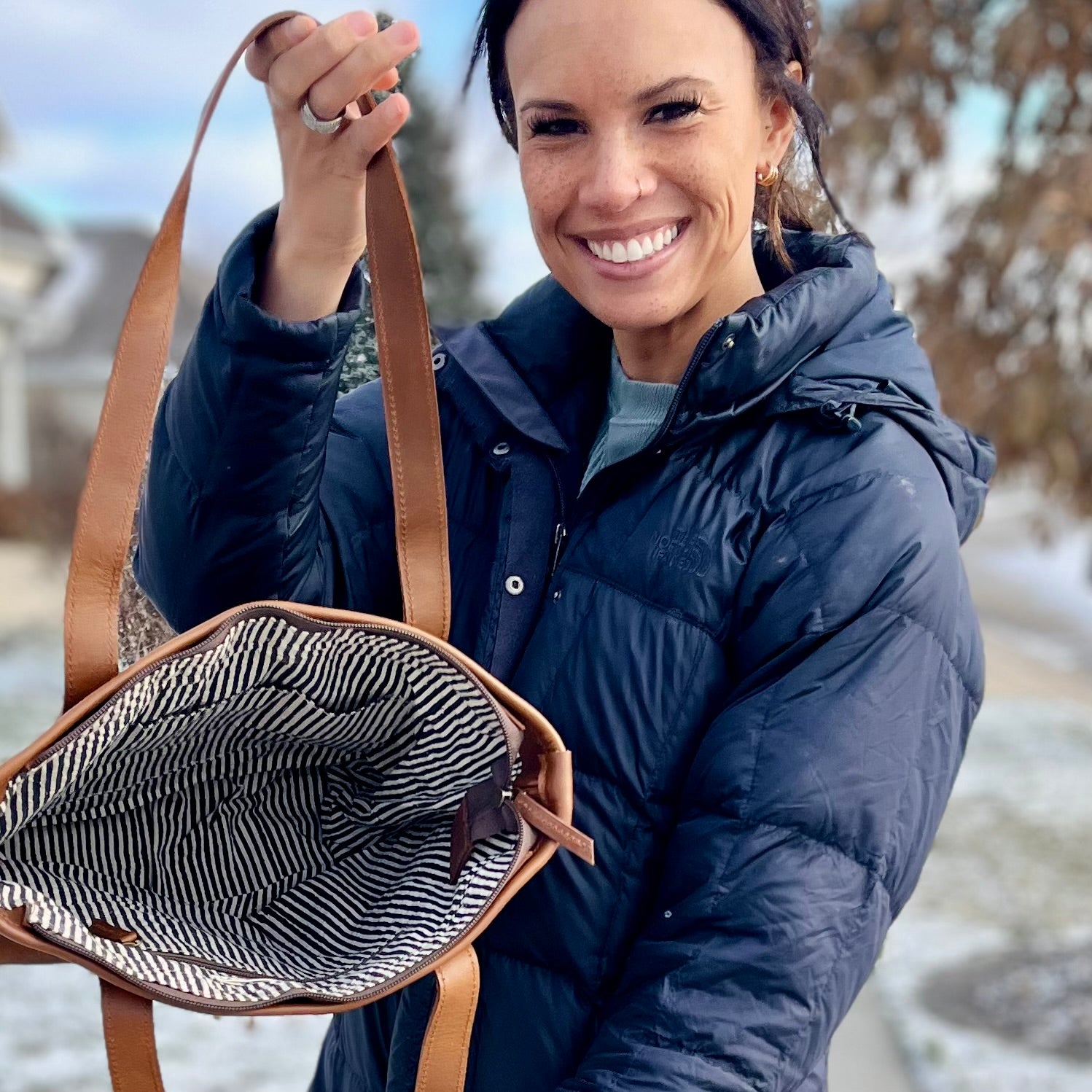 This all-purpose tote with zip closure is handmade from water buffalo leather with a gorgeous hand block printed cotton lining. The bag comes with a slip pocket as well as a zipper pocket– perfect for storing your phone and valuables. Non-adjustable straps. Your purchase of this bag directly supports our artisan partners at Khushbu Brand; these makers are paid a fair, living wage for their skilled work!
