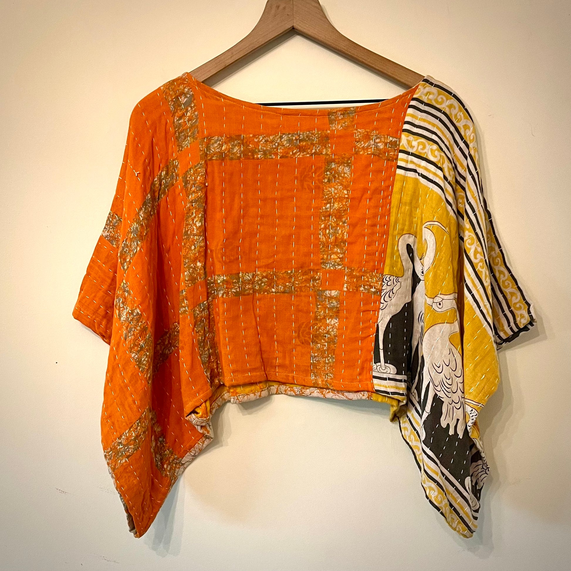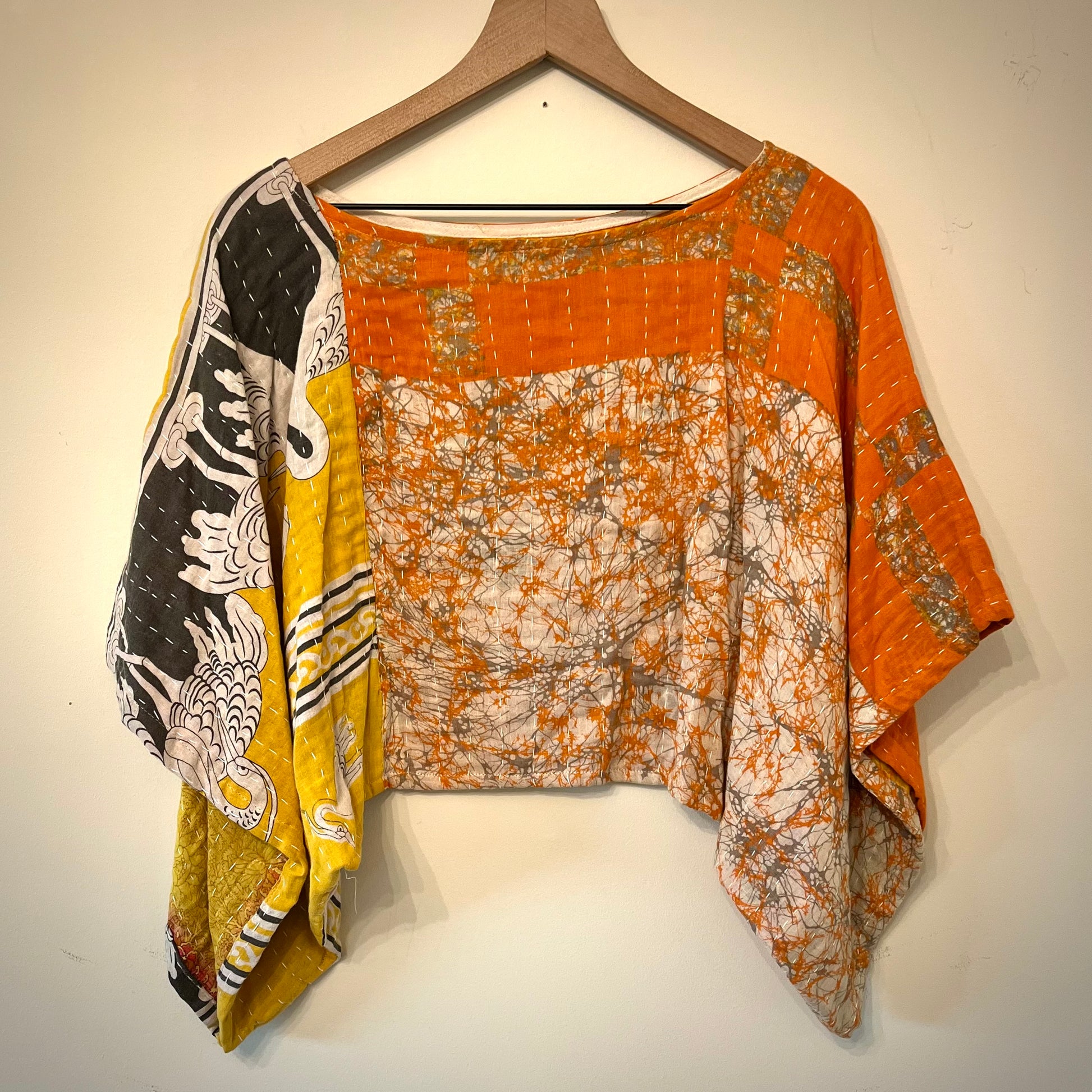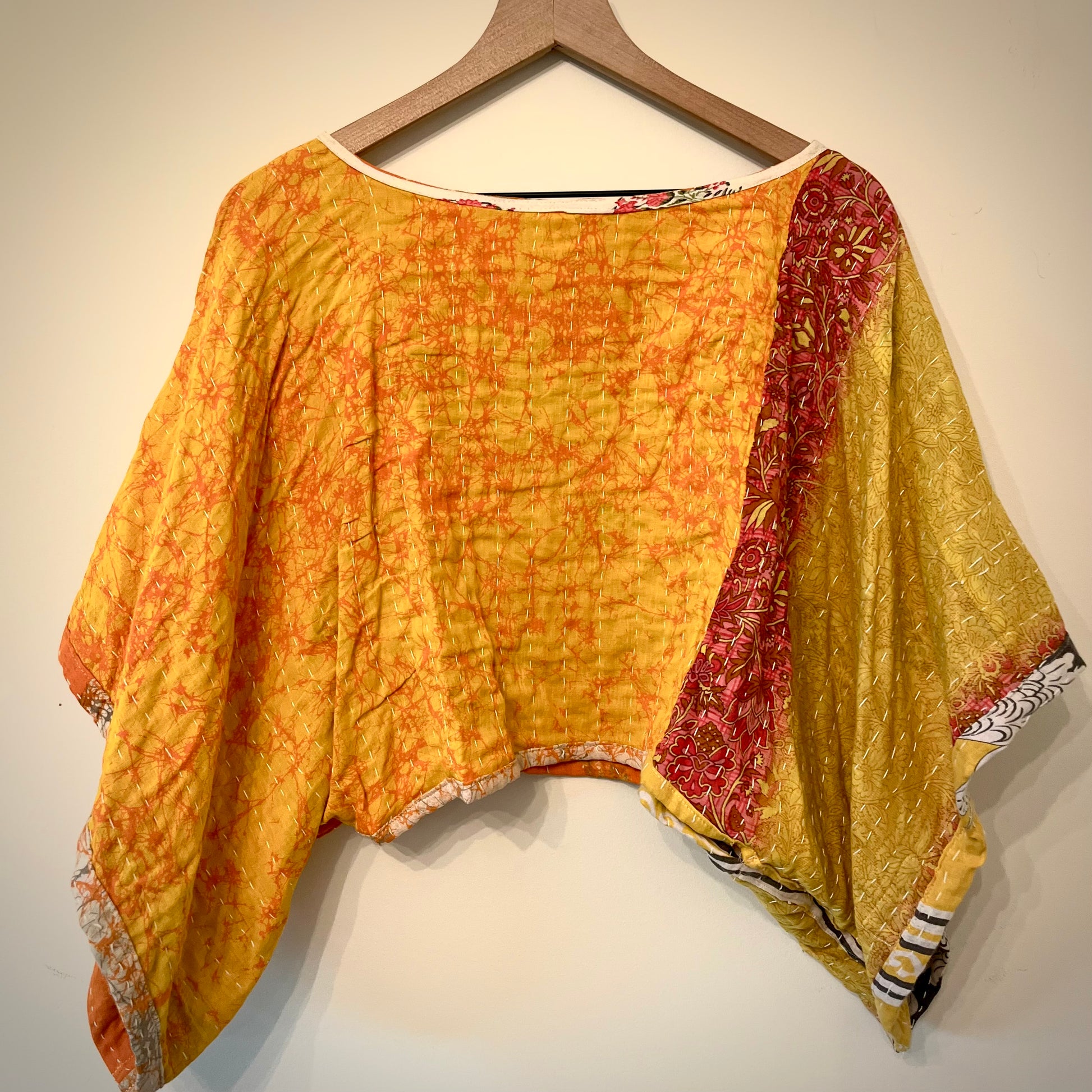 The Meli Shrug can be worn four ways (either side in front, either side out); calling it reversible is an understatement! The short length, wide neckline, and wide sleeves give it an easy, relaxed, and a little bit sexy look which looks great on its own, over dresses, over fitted long sleeved tops, and our favorite—with high waisted pants. Each shrug is One of A Kind. Our sizing is also unique! We have 2 sizes in the Meli Shrug (Size A & Size B). Some people can wear both sizes! Please visit our clothing model gallery to help you choose a size that fits you.