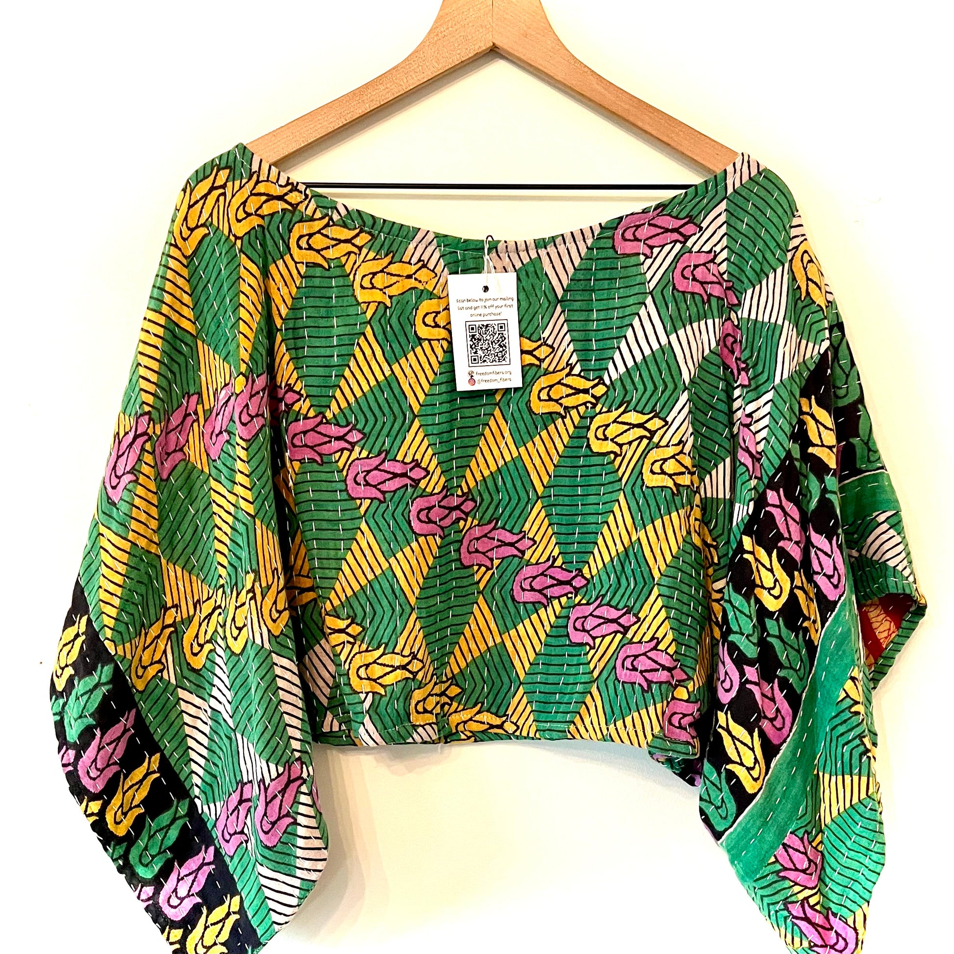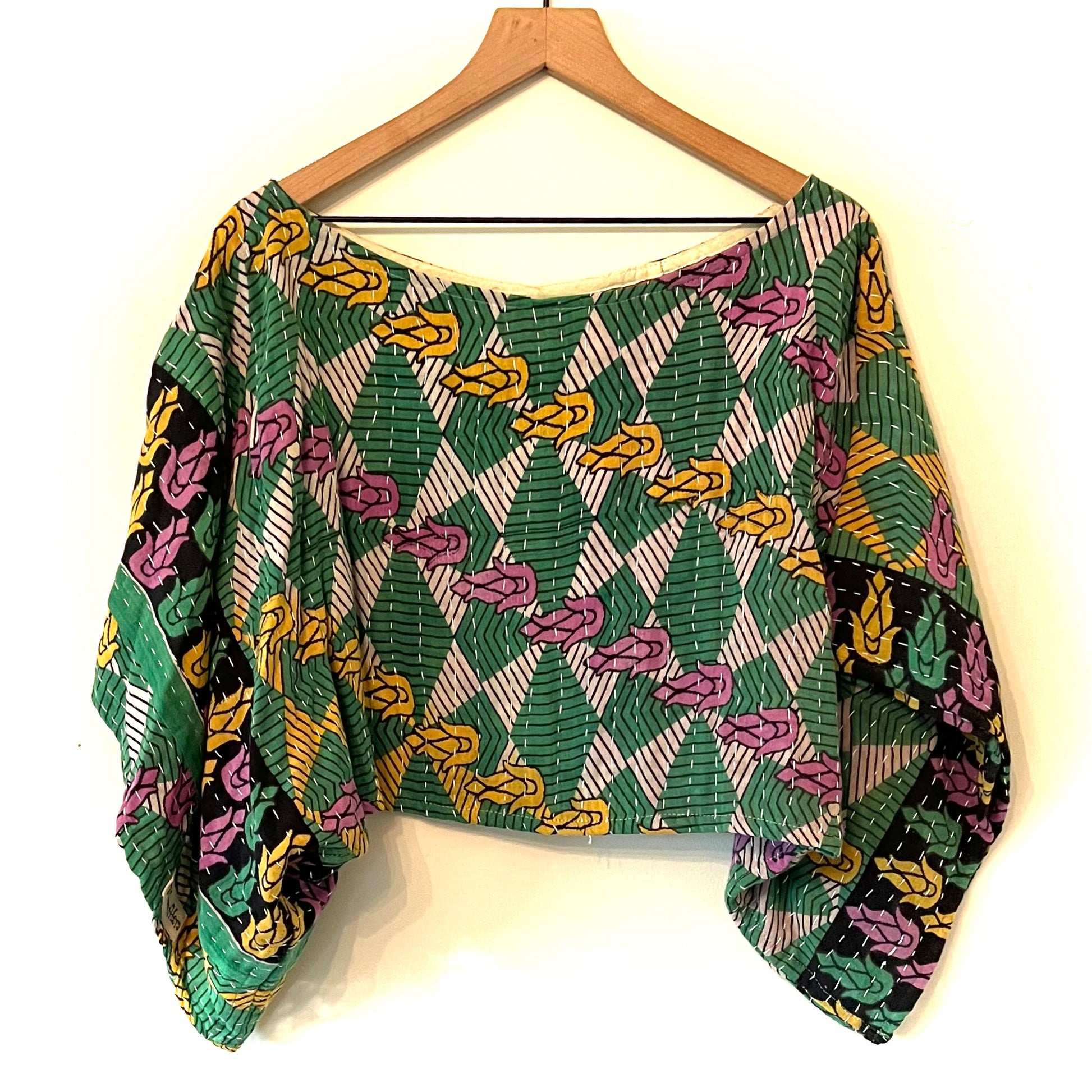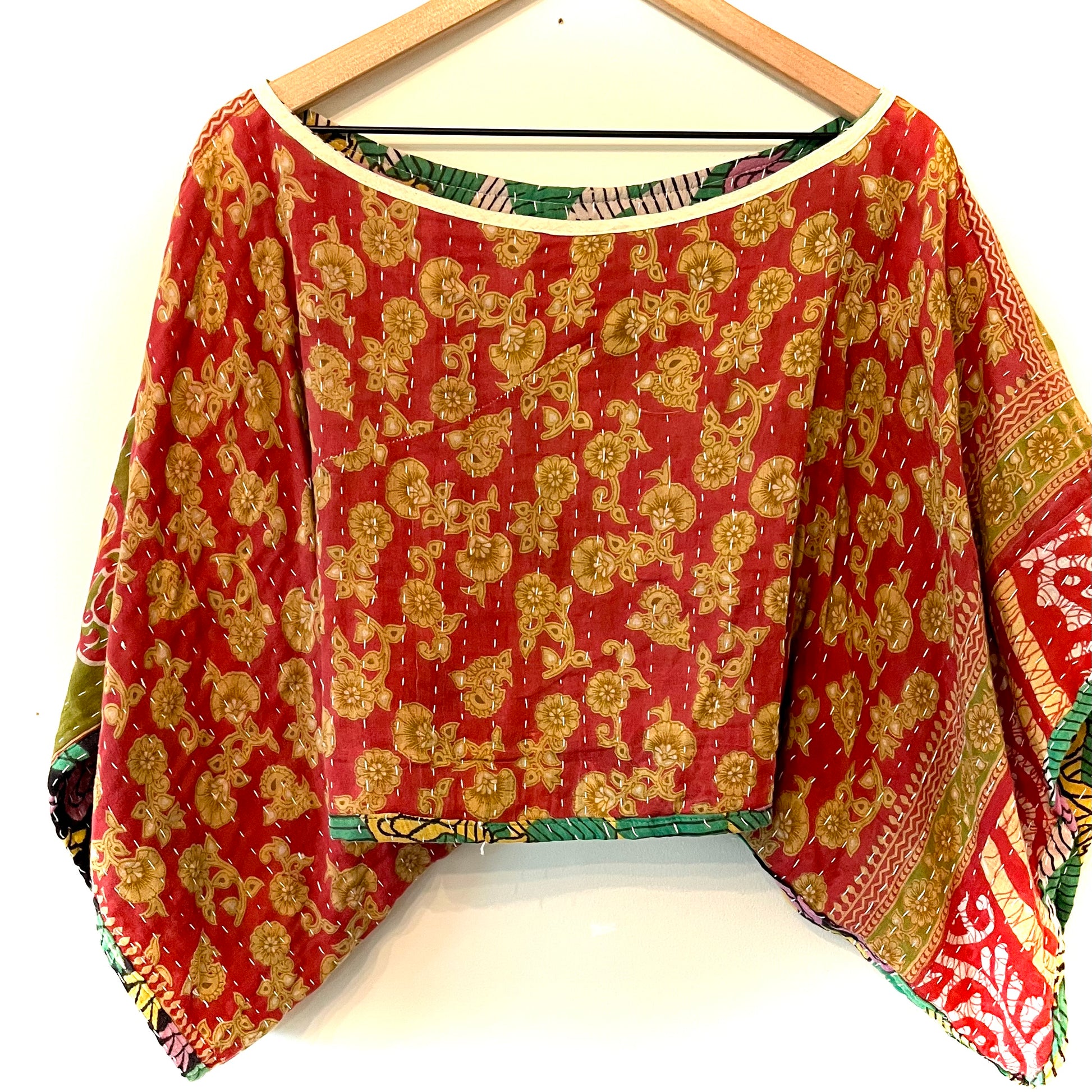 The Meli Shrug can be worn four ways (either side in front, either side out); calling it reversible is an understatement! The short length, wide neckline, and wide sleeves give it an easy, relaxed, and a little bit sexy look which looks great on its own, over dresses, over fitted long sleeved tops, and our favorite—with high waisted pants. Each shrug is One of A Kind. Different fabric patterns/colors are used to create each style which means that every piece of clothing that you put in your closet will be uniquely YOU and uniquely YOURS. Our sizing is also unique! We have 2 sizes in the Meli Shrug (Size A & Size B). Some people can wear both sizes! Please visit our clothing model gallery to help you choose a size that fits you.