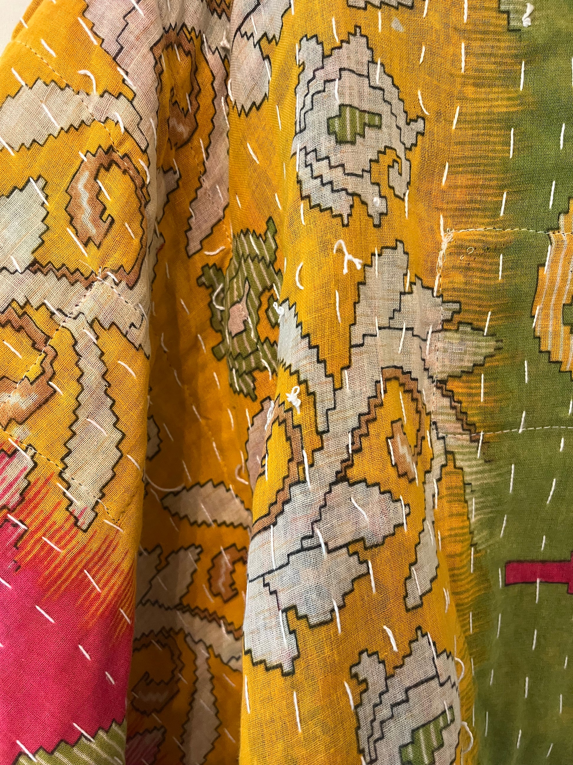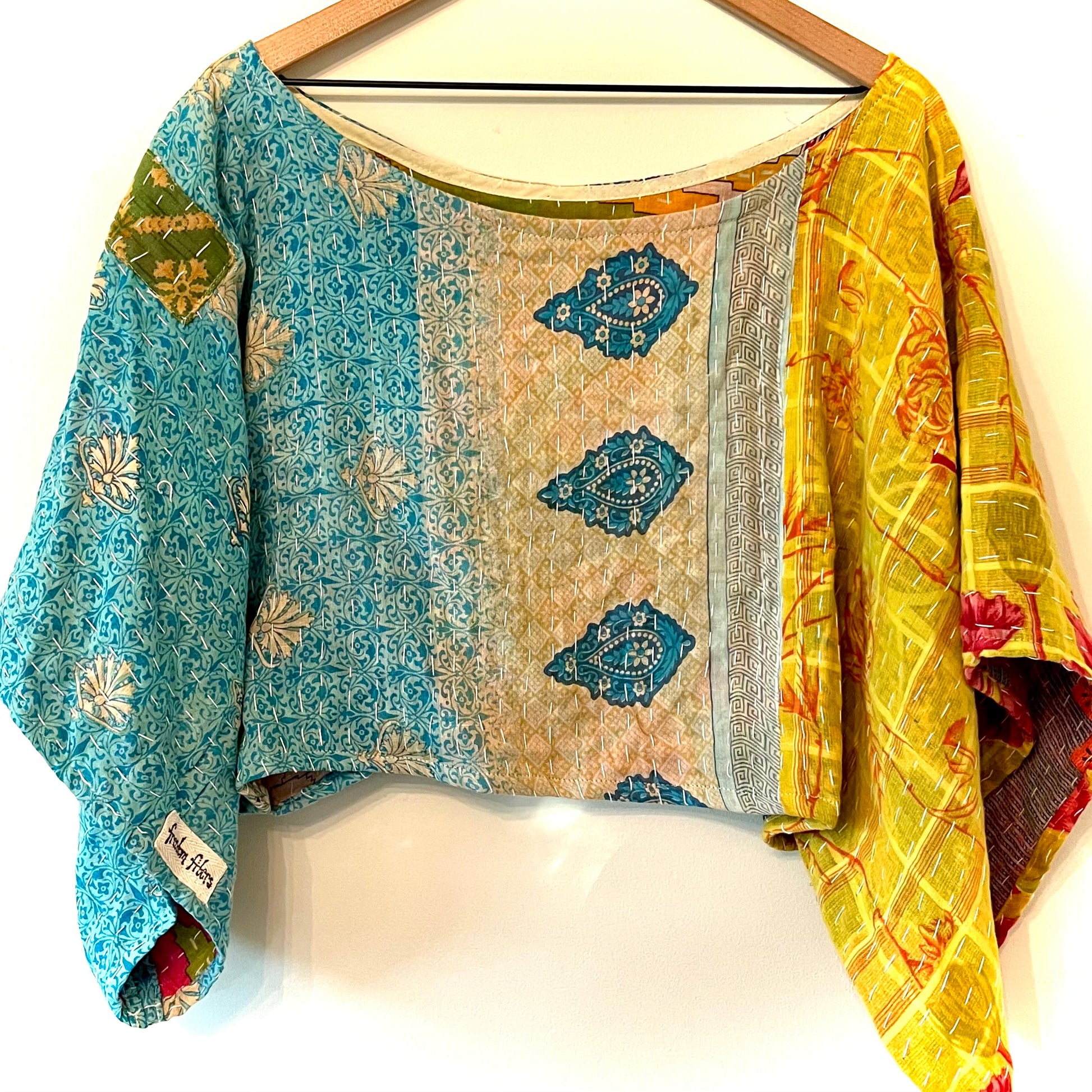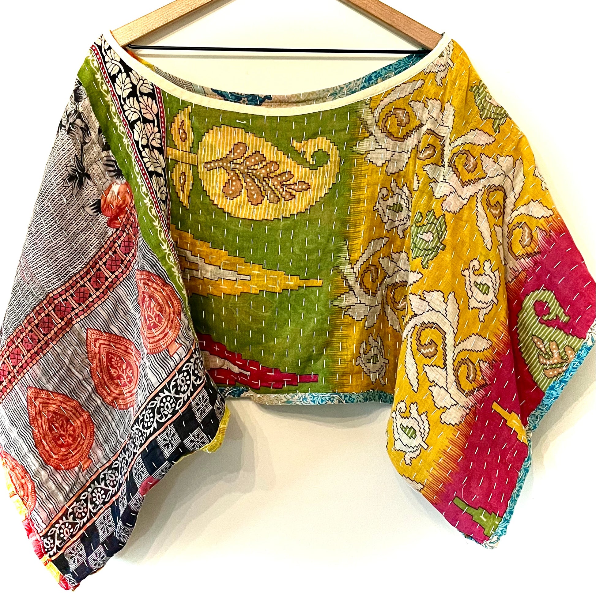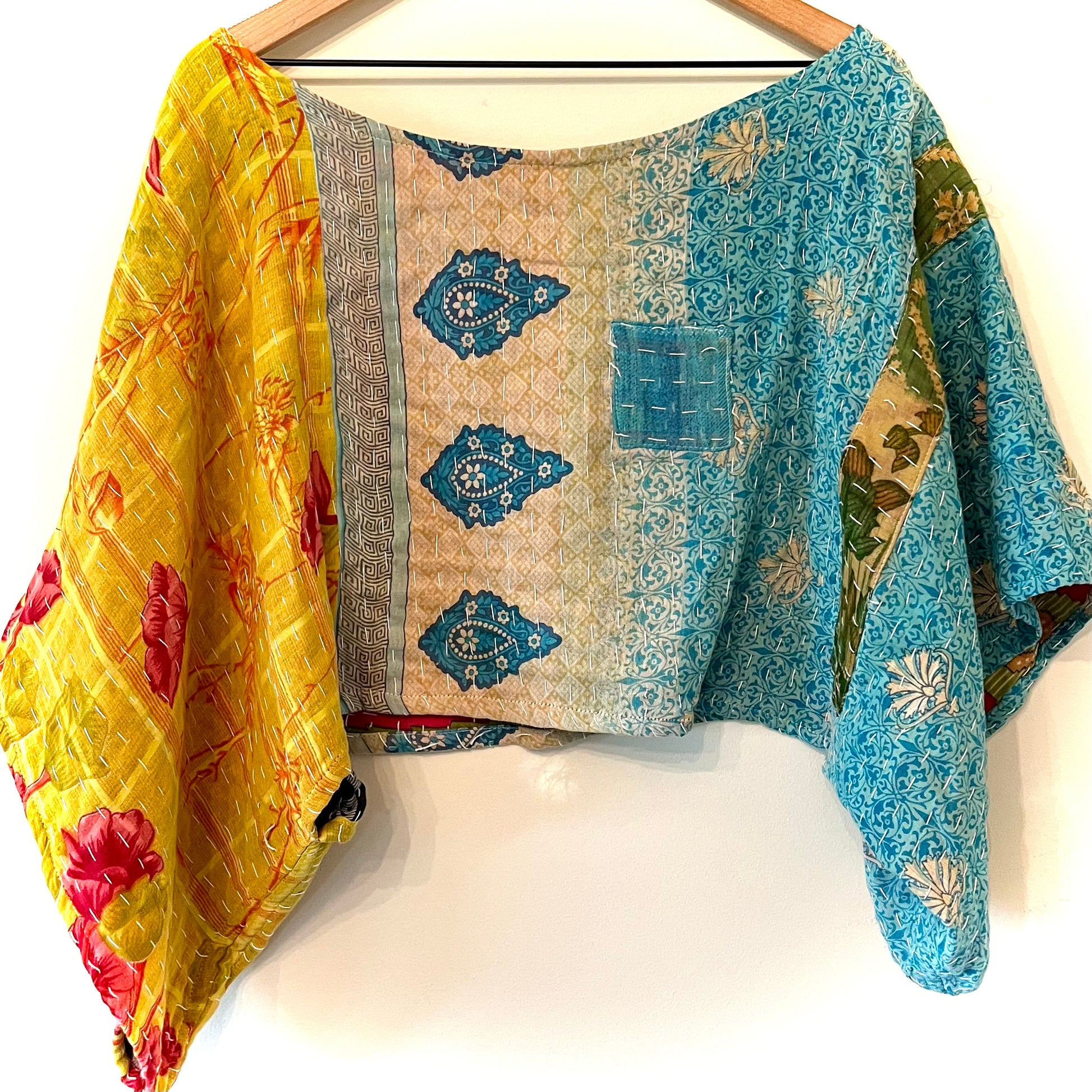 The Meli Shrug can be worn four ways (either side in front, either side out); calling it reversible is an understatement! The short length, wide neckline, and wide sleeves give it an easy, relaxed, and a little bit sexy look which looks great on its own, over dresses, over fitted long sleeved tops, and our favorite—with high waisted pants. Each shrug is One of A Kind. Different fabric patterns/colors are used to create each style which means that every piece of clothing that you put in your closet will be uniquely YOU and uniquely YOURS. Our sizing is also unique! We have 2 sizes in the Meli Shrug (Size A & Size B). Some people can wear both sizes! Please visit our clothing model gallery to help you choose a size that fits you.