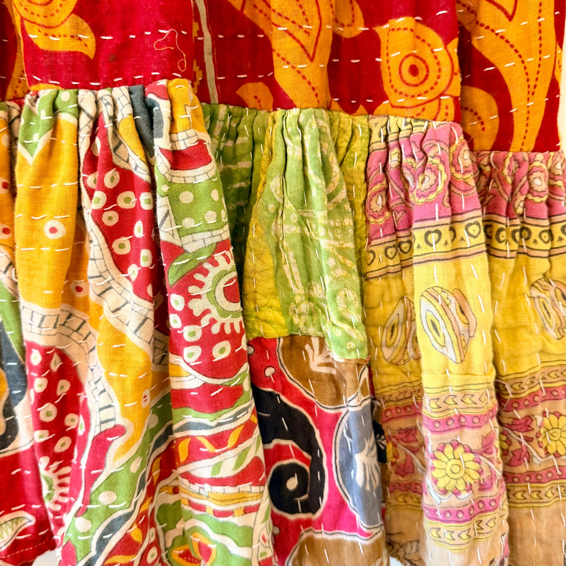 The Poetry Dress (midi length) is fun and flirty. Made from 3 ultra-thin layers of repurposed cotton saris which are hand embroidered with a running or “kantha” stitch, each dress is one of a kind and will never be reproduced. While we make every effort to represent true colors in each photo, we believe the close-up shot is generally the most accurate. Our sizing is also unique! The Poetry Dress comes in 2 sizes. Please visit our size fit gallery see how our sizes look on different body types.