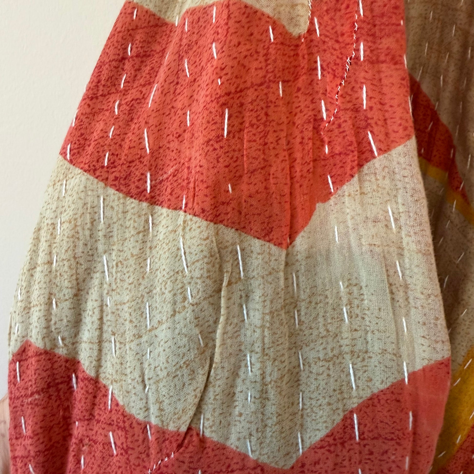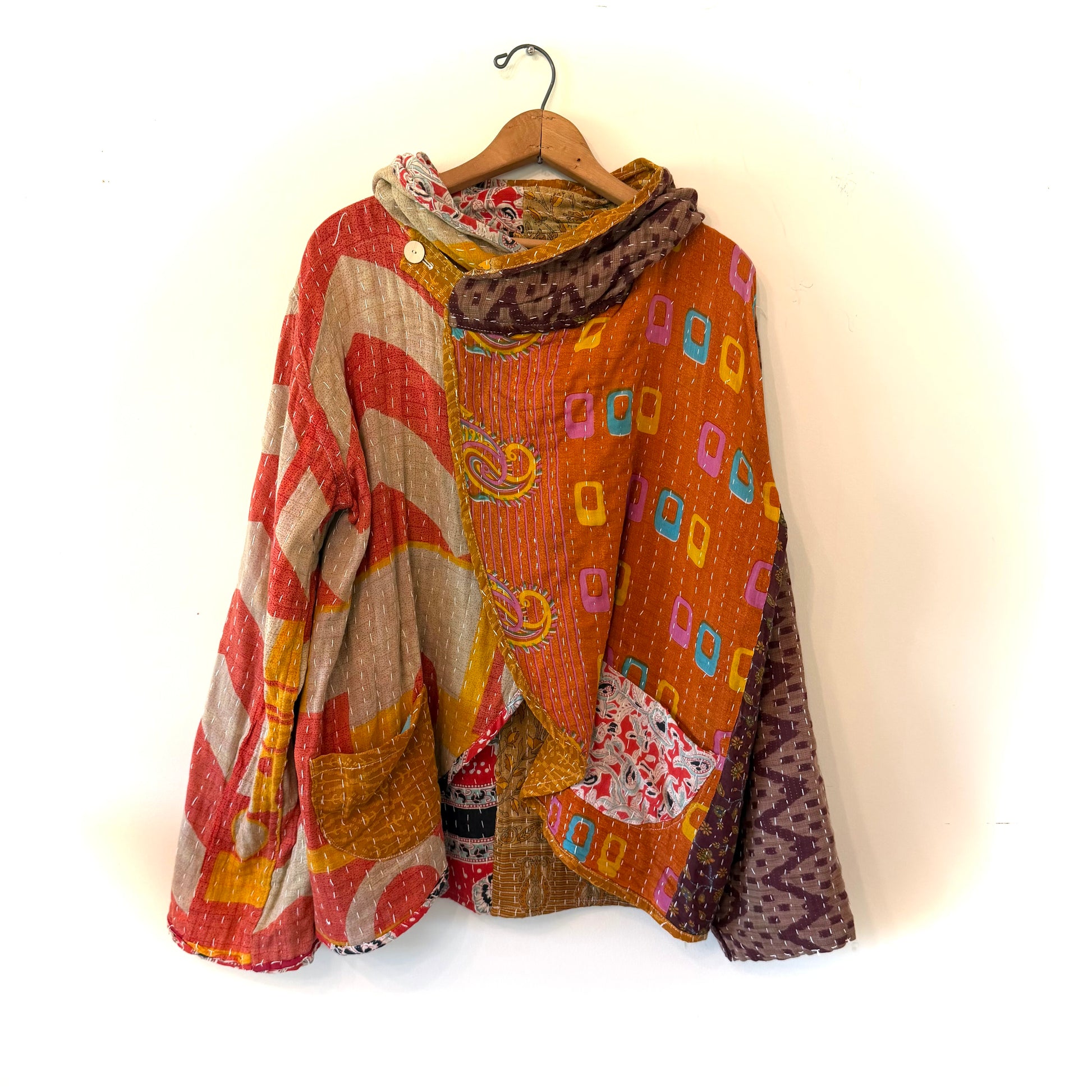 The excessively cool, earthy-beautiful Topi Jacket is a casual show-stopper! We love the big hood, relaxed style, and comfortable softness. And as always with our kantha garments, each jacket is completely unique and One Of A Kind. This is the exact jacket you will receive.