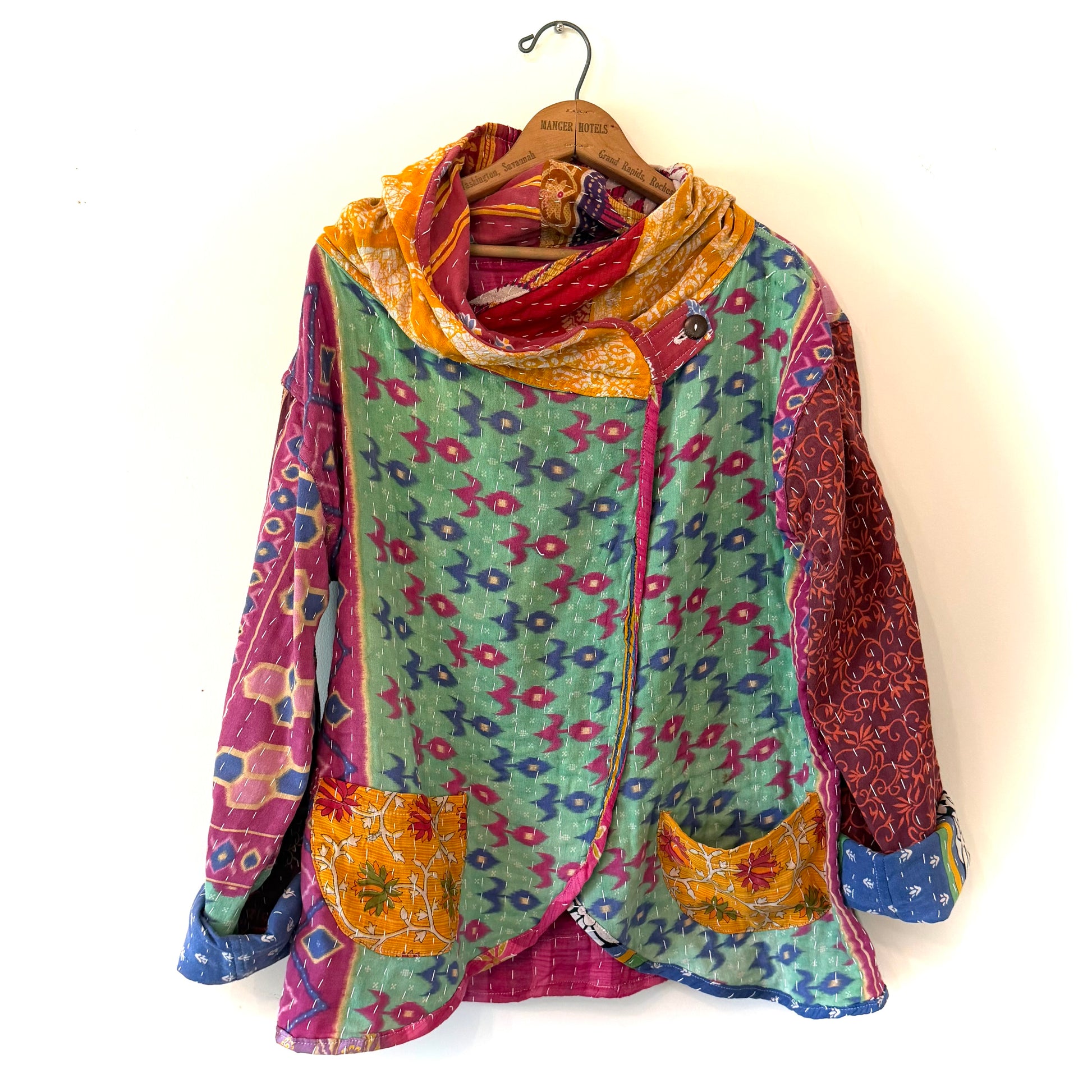 The excessively cool, earthy-beautiful Topi Jacket is a casual show-stopper! We love the big hood, relaxed style, and comfortable softness. And as always with our kantha garments, each jacket is completely unique and One Of A Kind. This is the exact jacket you will receive.
