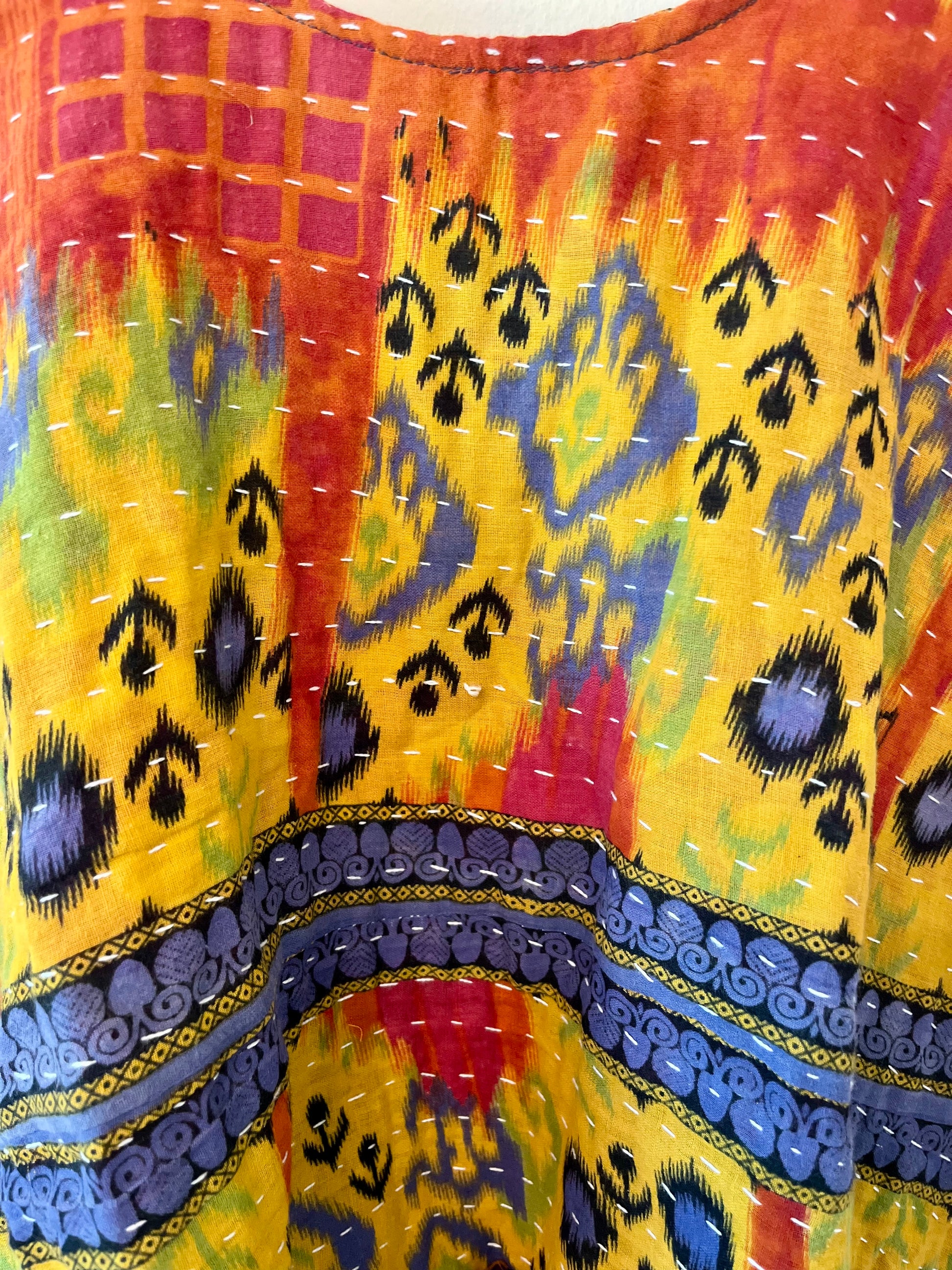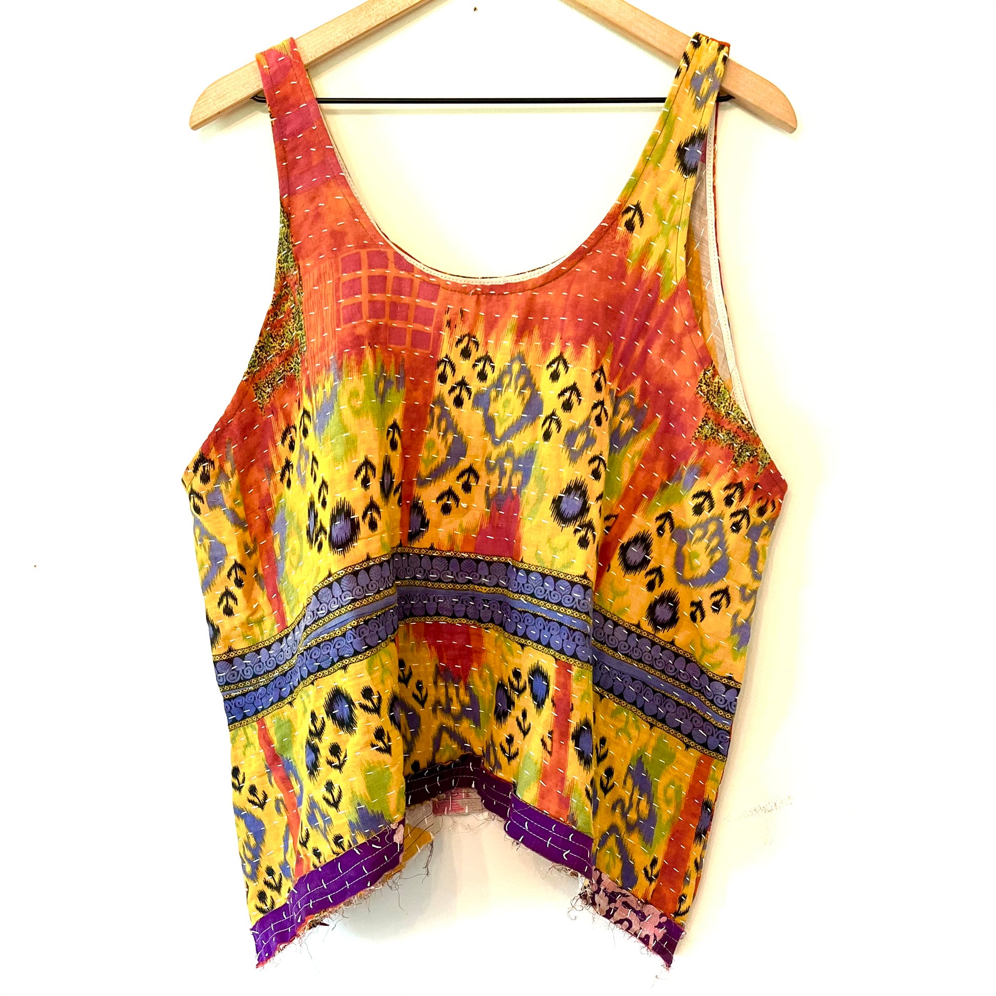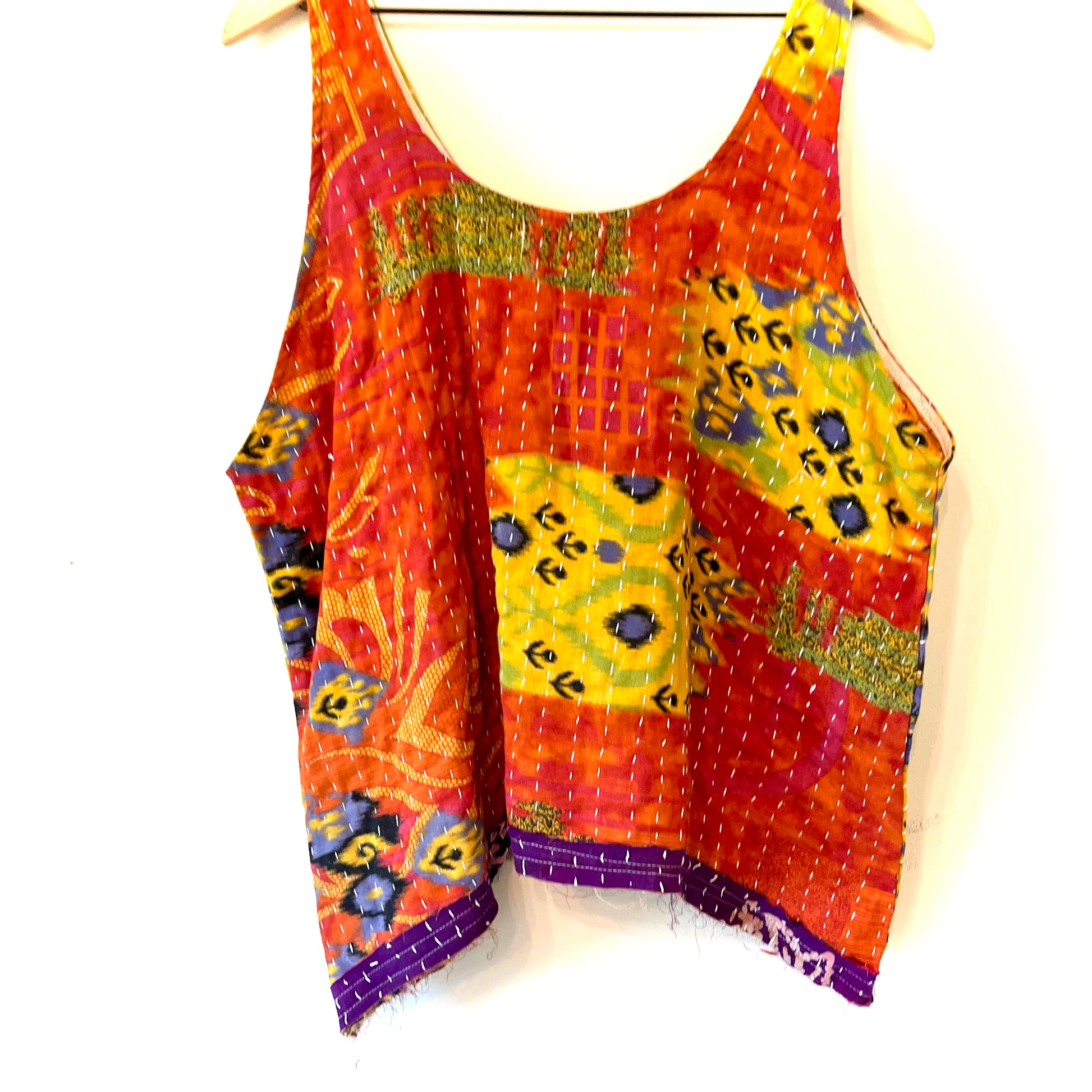 The Tasha Tank is our favorite breezy and breathable cotton top for the hottest days of summer. We love it so much that we wear it year-round layered under cardigans or over fitted turtlenecks. And we LOVE to wear it over-sized. Made from 3 ultra-thin layers of repurposed cotton saris which are hand embroidered with a running or “kantha” stitch, each dress is one of a kind and will never be reproduced. Our sizing is also unique! The Tasha Tank comes in 3 sizes (Sizes A, B, & C); many customers find they can wear at least 2 sizes, depending on the desired drape and fit. Please visit our size fit gallery see how our sizes look on different body types. This is the EXACT item you will receive.