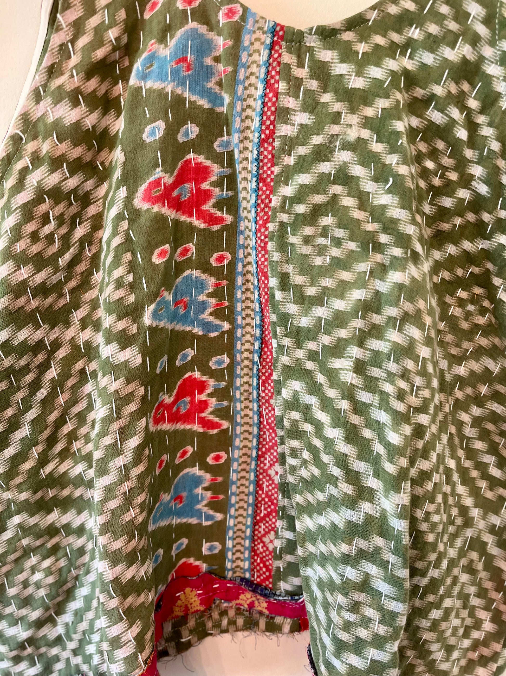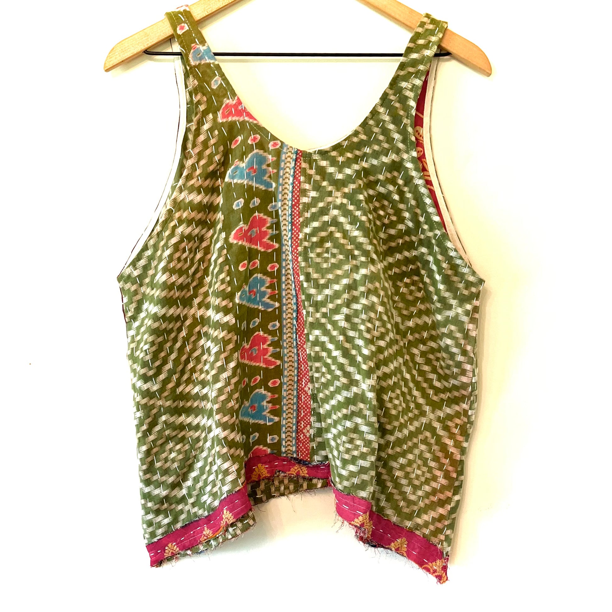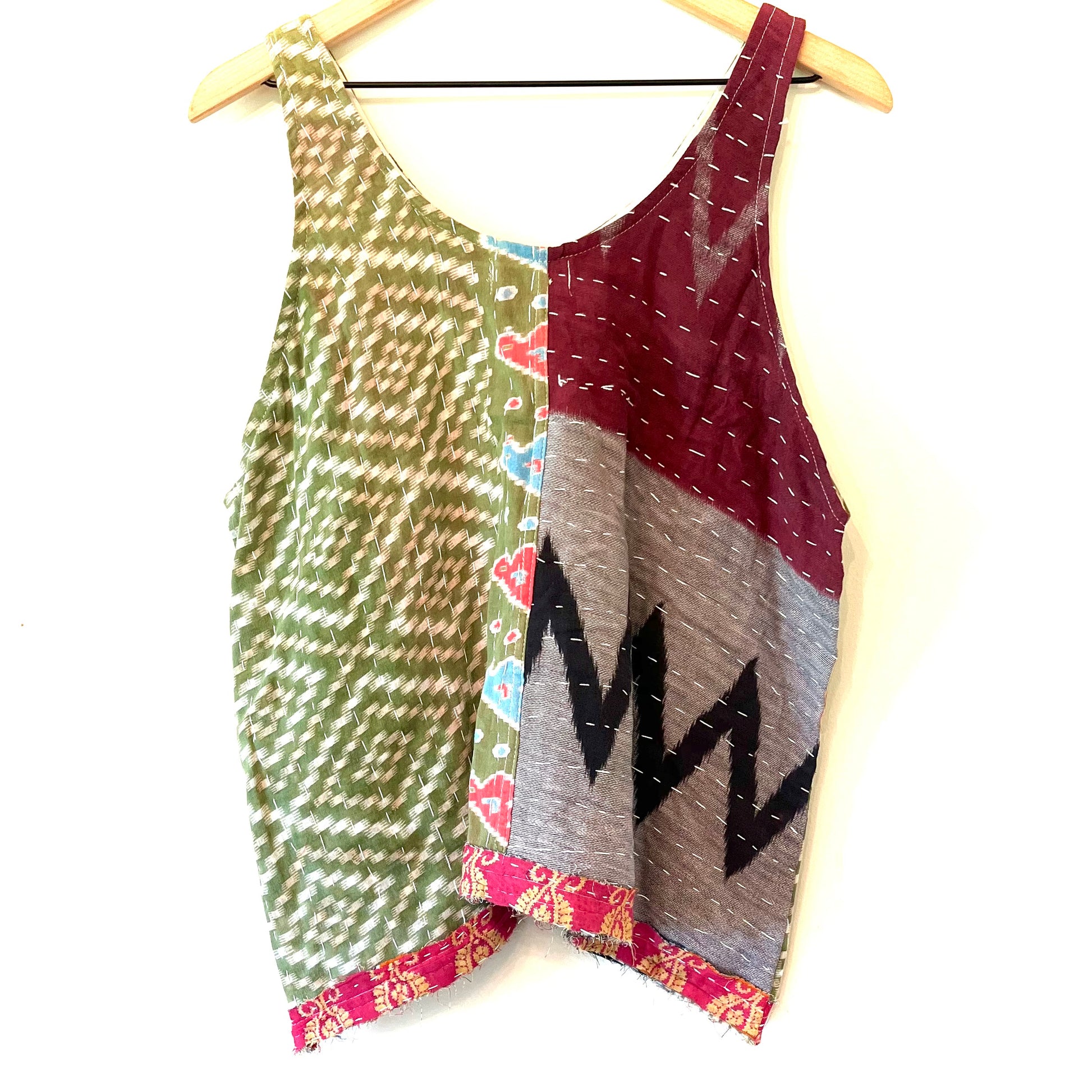 The Tasha Tank is our favorite breezy and breathable cotton top for the hottest days of summer. We love it so much that we wear it year-round layered under cardigans or over fitted turtlenecks. And we LOVE to wear it over-sized. Made from 3 ultra-thin layers of repurposed cotton saris which are hand embroidered with a running or “kantha” stitch, each dress is one of a kind and will never be reproduced. Our sizing is also unique! The Tasha Tank comes in 3 sizes (Sizes A, B, & C); many customers find they can wear at least 2 sizes, depending on the desired drape and fit. Please visit our size fit gallery see how our sizes look on different body types. This is the EXACT item you will receive.